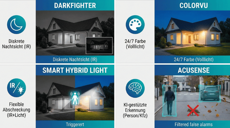 Die DarkFighter Technologie sorgt für gestochen scharfe Bilder bei extrem schwachem Licht. Während andere Kameras nur Rauschen zeigen, liefert dieser Sensor klare Details.
