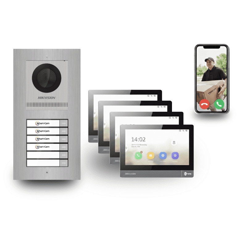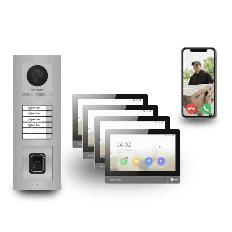 4-Familienhaus Video-Türsprechanlage Set mit 4 Klingeln kaufen bei Smart-Cam. Unsere Komplettsysteme für Vierfamilienhäuser bieten vier Klingelknöpfe und Innenstationen. Jedes 4-Familienhaus Video-Türsprechanlage Set enthält eine HD-Kamera-Aussenstation, vier Touchscreen-Monitore und Installationsmaterial. Verfügbar als PoE-IP- oder 2-Draht-System mit App-Steuerung per Smartphone.