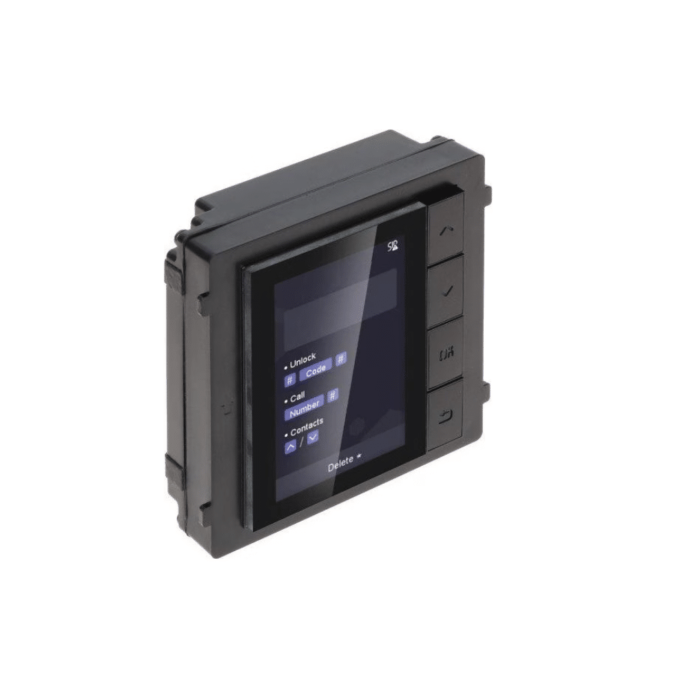 Das Hikvision DS-KD-DIS ist das zentrale Informations- und Navigationsmodul der Pro-Serie. Es bietet eine intuitive Benutzeroberfläche für modulare Türstationen, ideal für große Wohnanlagen und Bürogebäude mit bis zu 2.000 Kontakten.