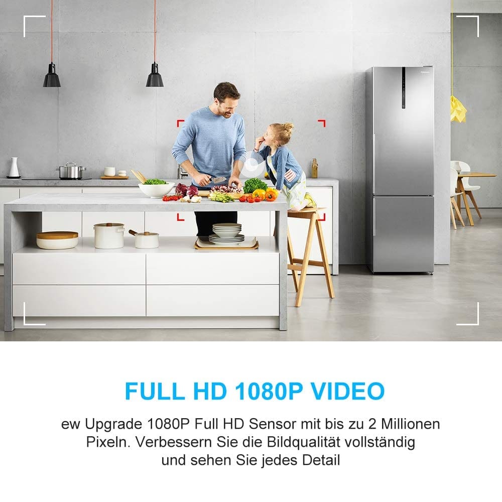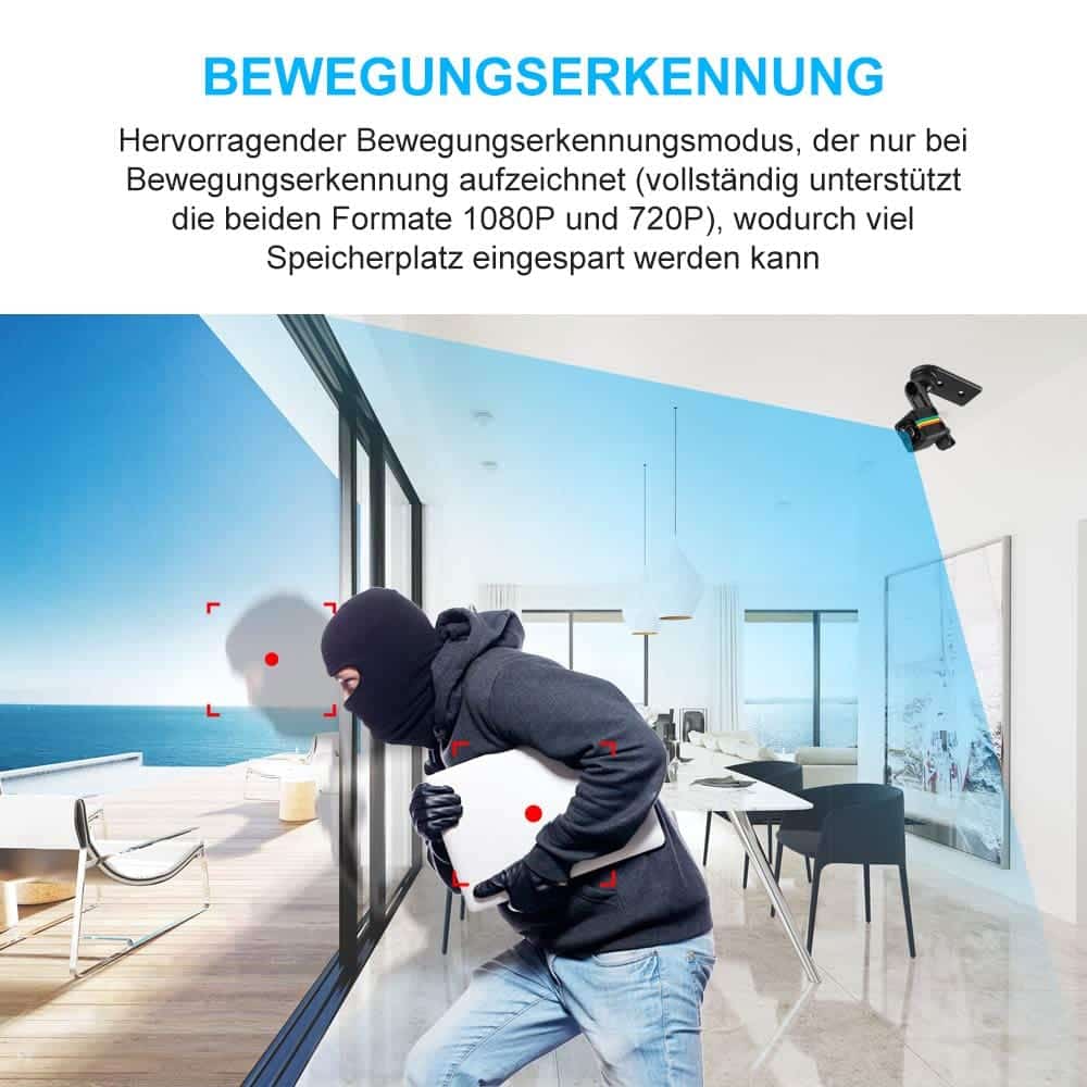 Mit erstaunlicher HD-Videoqualität von 1920 x 1080P und 30fps erhalten Sie mehr Details und ein klareres Videobild, um zu wissen, was vor sich geht. Wenn Sie weg sind, unterstützt diese mini Kamera Loop Aufnahme und aufnimmt und wiedergrabt mit lokaler Micro-SD-Karte 32 GB.
