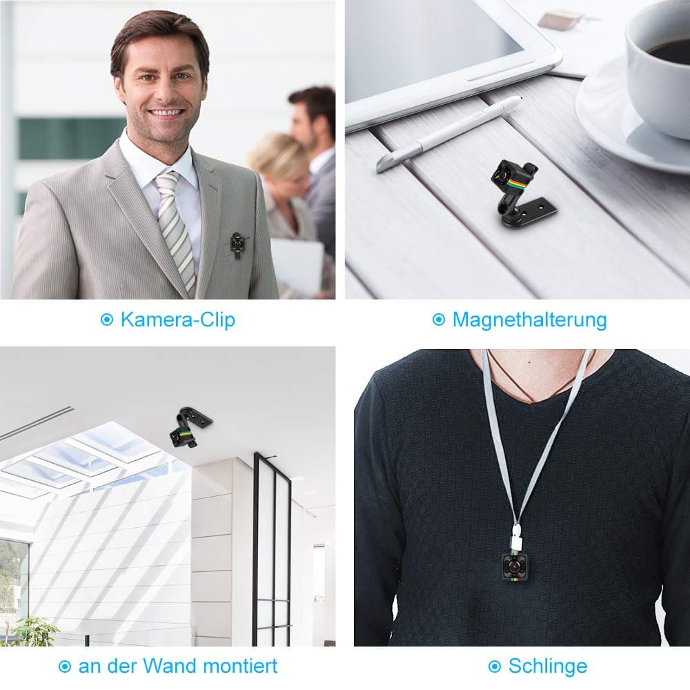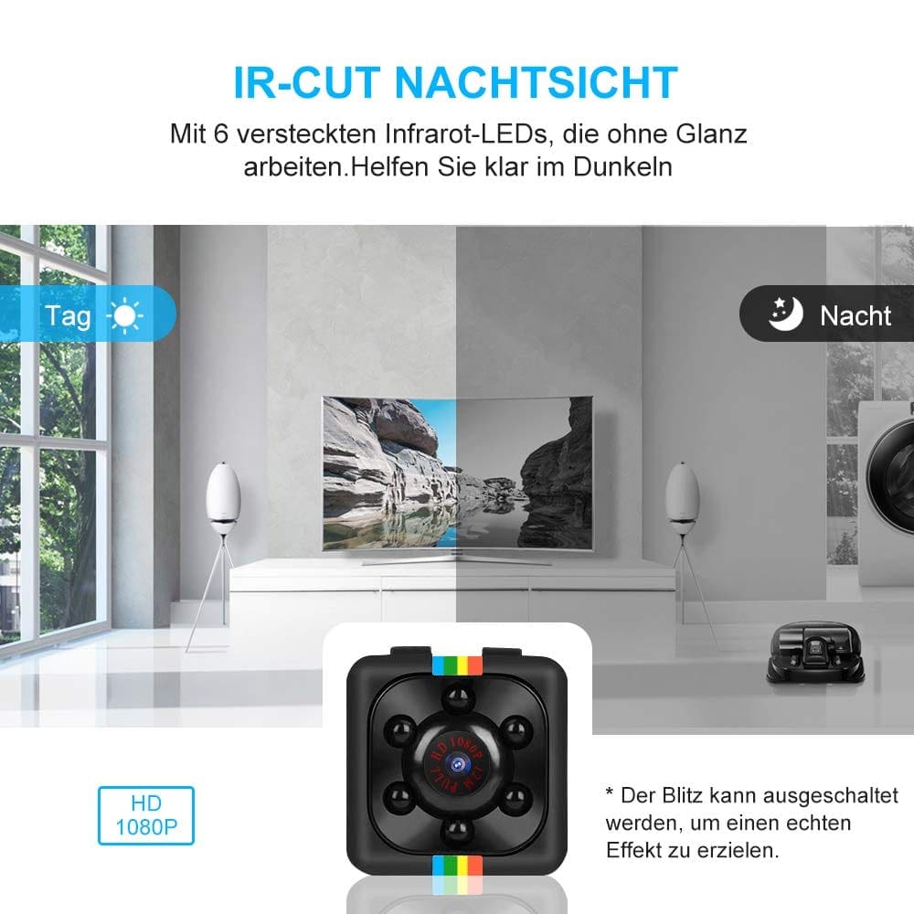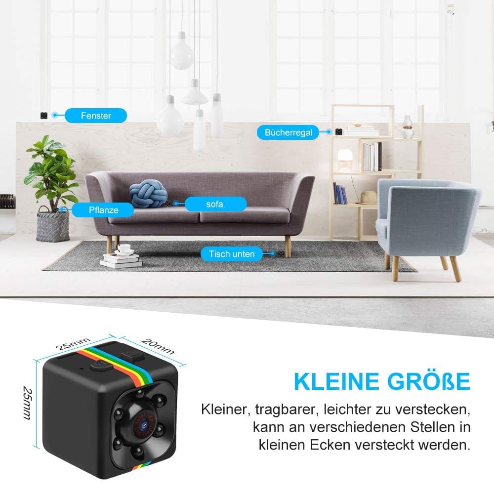 Mini Kamera, mit der kleinsten tragbaren Grösse, hilft Ihnen, Menschen und Orte, die Sie am meisten interessieren, genau zu beobachten. Mit einer Auflösung von 1080p, einem Weitwinkelobjektiv mit 140 ° und 6 IR-LED-Lichtern erfasst es klare Bilder und eine bessere Sichtbarkeit als andere Minikameras. Es ist ideal für die Installation an Orten, an denen Benutzer nicht erkennen, dass sie die Sicherheit von Häusern, Büros, Geschäften und Lagern verbessern können, sodass Sie sicher sind und nichts verpassen.