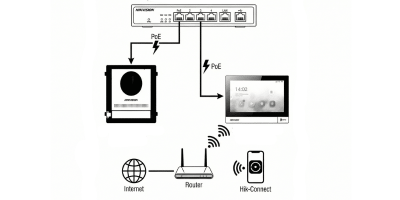 1. Einstecken: Verbinden Sie die Türstation und den Monitor einfach per Netzwerkkabel mit dem mitgelieferten PoE-Switch.