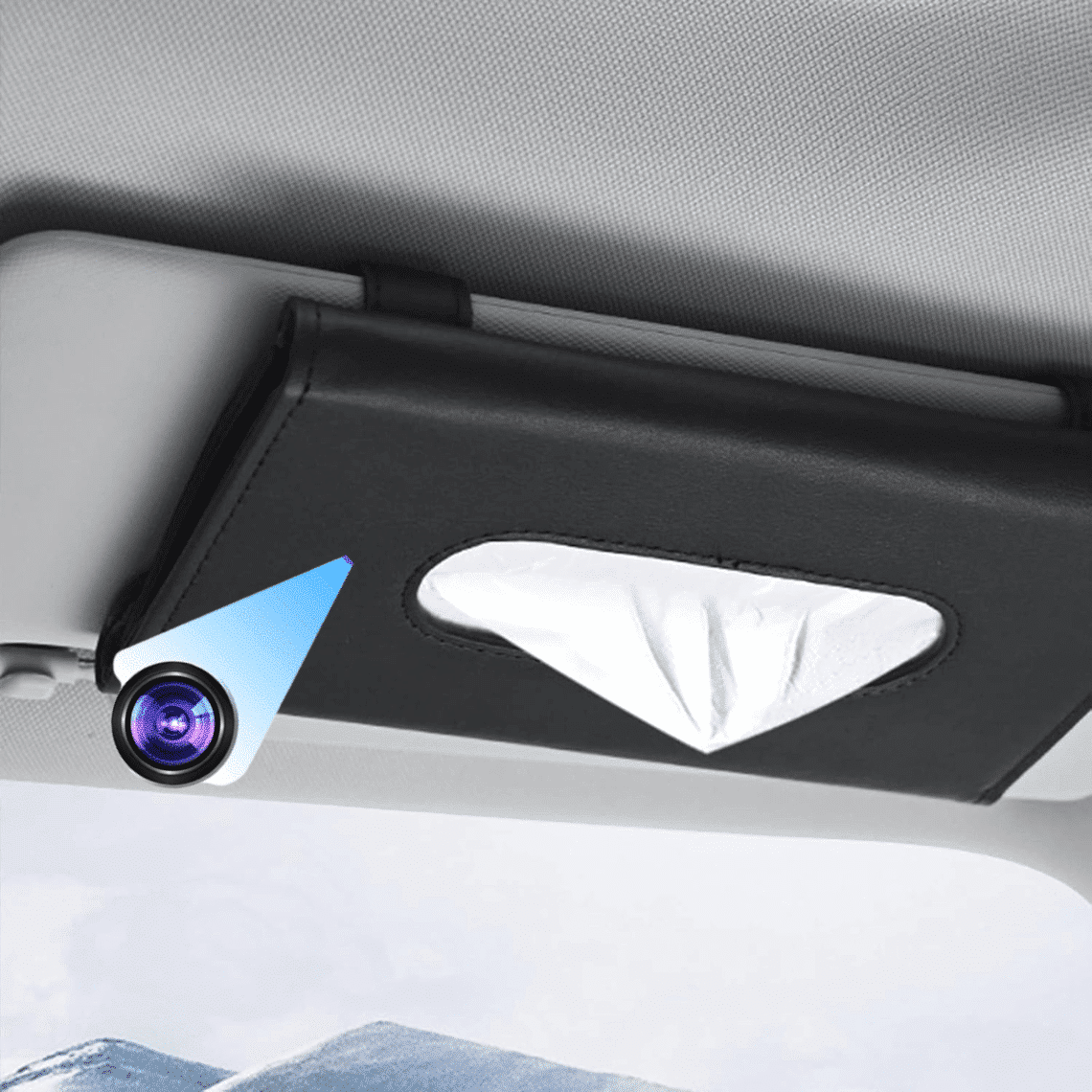 Sorgen Sie für Ordnung und Sicherheit in Ihrem Fahrzeug. Diese elegante Taschentuchbox aus hochwertigem PU-Leder lässt sich einfach an der Sonnenblende befestigen. Das Besondere: Im Inneren verbirgt sich eine leistungsstarke Mini-Kamera inklusive Mikrofon für diskrete Überwachung.