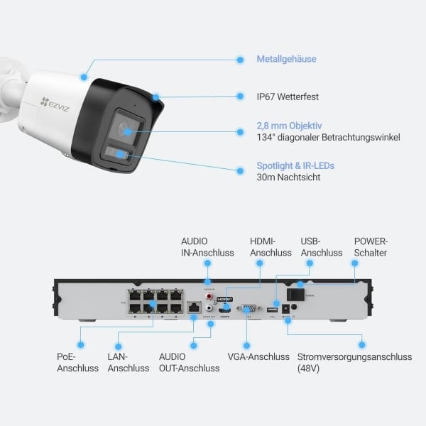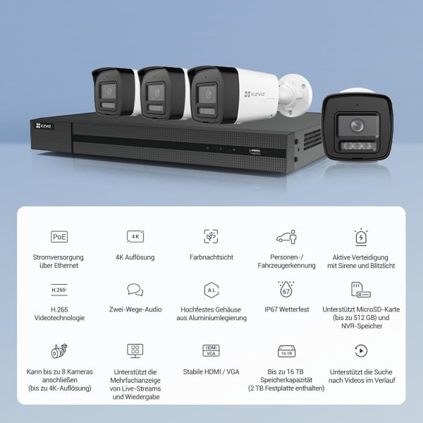 Das EZVIZ H3K PoE 4K Überwachungskamera Kit bietet hochauflösende 4K-Videoüberwachung mit KI-Unterstützung. Komplett-Set mit NVR und PoE-Kameras für professionelle Sicherheit rund um Ihr Zuhause oder Unternehmen.
