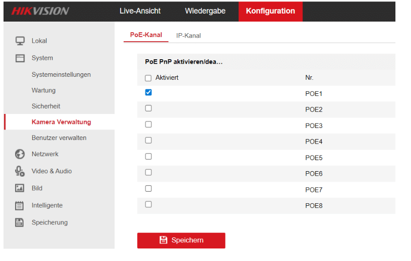 - Gehen Sie zu Konfiguration > Kamera Verwaltung > PoE-Kanal.