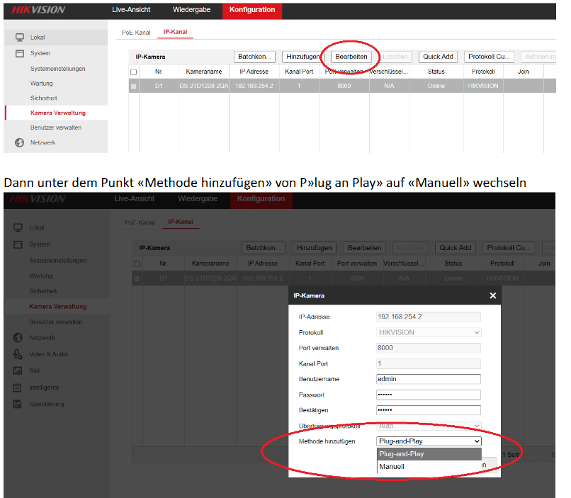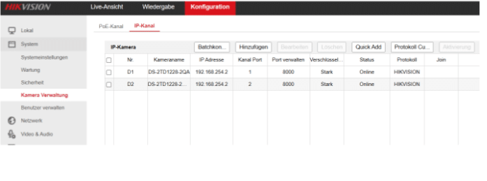 Die Kamera wird zunächst automatisch via Plug-and-Play erkannt und ist „Online“. Um weitere Kanäle hinzuzufügen, müssen wir diesen Automatismus bearbeiten.