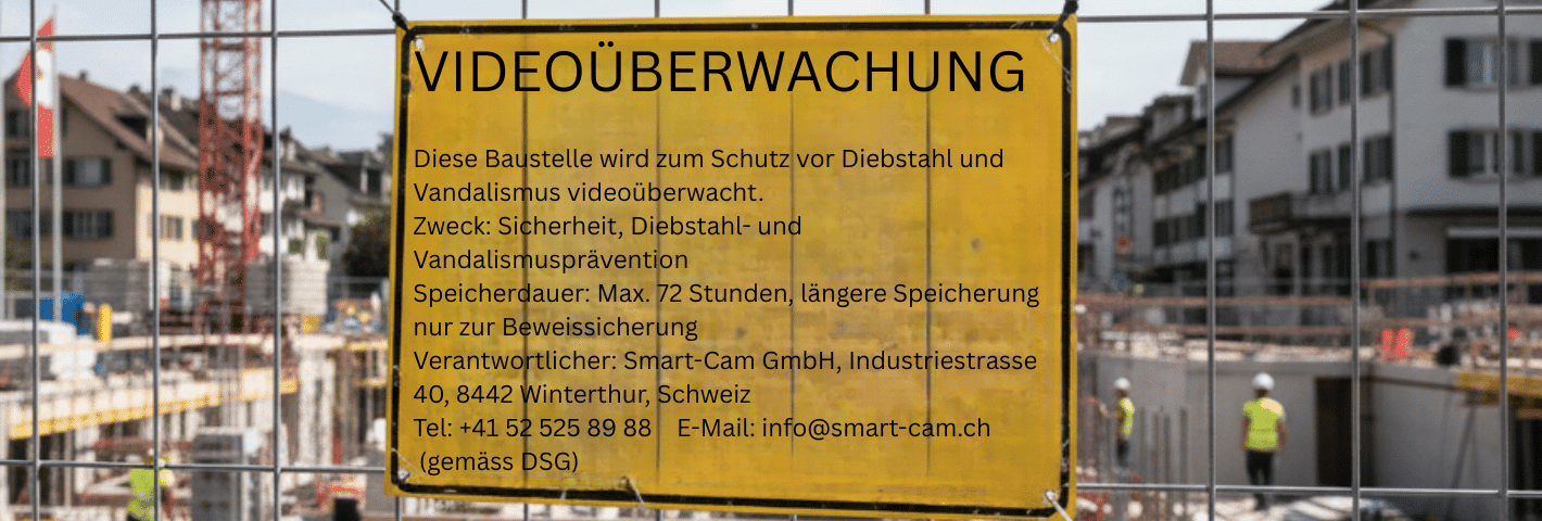 In der Regel werden hierfür Schilder mit einem Kamerasymbol und einem kurzen Hinweistext angebracht, etwa „Achtung, dieses Gelände wird videoüberwacht“. Solche Schilder sollten an allen Zugängen zur Baustelle platziert werden (z.B. am Bauzaun, Tor oder Eingang zum Gebäude), idealerweise in Augenhöhe und ausreichend gross, damit sie nicht übersehen werden. Für Firmenbaustellen ist es ratsam, auf dem Schild auch die verantwortliche Stelle zu nennen – etwa den Namen des Bauunternehmens oder Bauherren – sowie einen Kontakt (Telefonnummer oder E-Mail-Adresse). So wissen Betroffene, an wen sie sich bei Fragen zum Datenschutz wenden können. Diese Transparenz schafft Vertrauen und stellt sicher, dass die Überwachung nicht „im Verborgenen“ erfolgt.